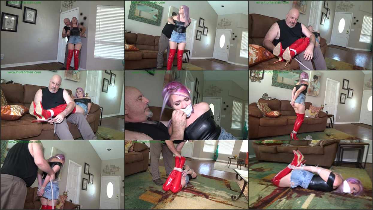 Pretty spoiled heiress Olivia is finally home from the oppressive boarding school her rich daddy had sent her to. But daddy still tried to keep his petulant little girl out of trouble by hiring the Hunter to watch over Olivia while he was away on business. But Olivia thought she could outsmart the big oaf, dresses in her stiletto red boots and tiny denim mini skirt that barely covers the cheeks of her ample ass she sneaks through the house, tip-toeing as she peeks around the corner looking to see if her body guard is in sight. She thinks the coast is clear and heads for the door in the hopes of jumping into a waiting Uber to take her to the night club where she can drink, flirt and fuck to her little hearts delight. But as she opens the door she is suprised by the Hunter who pushes her back into the house, closes and lockes the door. He looks down at the tiny girl and demands to know what she is doing dressed like a slut. Olivia tries to bluff and bluster her way past the Hunter, she tells him that he can’t stop her she is an adult and can do whatever she wants. But the Hunter is under strict orders to keep petulant Olivia out of trouble by any means nessacary. He pushes her over to the living room and pulls her hands behind her back. Olivia protests and threatens him as her wrists are tightly bound behind her back…