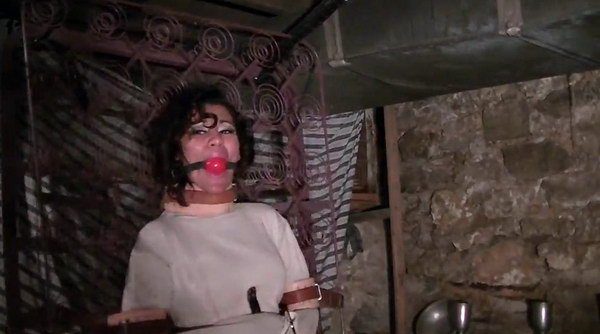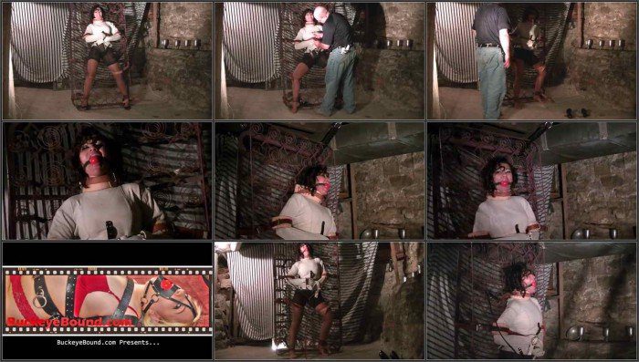 Sahrye is held captive, stripped to shiny hose and put in a tight straitjacket, she’s bound by leather straps to a set of bedsprings as she struggles to free herself. Her captor enters to taunt her, secure her bonds and add more straps. Later he gags her, then taunts her with jumper cables.