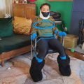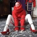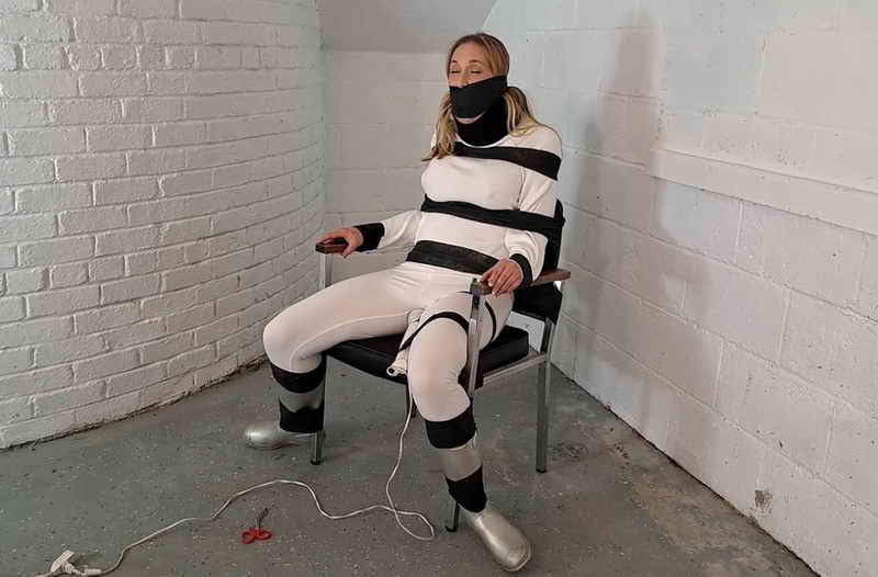 Pretty homeowner Ophelia is ready for winter in white TNA leggings, hunter boots and a white turtleneck sweater. Unfortunately she enters her home while another woman dressed for winter in a turtleneck and ugg boots is there robbing the place. Ophelia is ushered into an icky little room in her basement by the hair. She is frisked in her white leggings and then bound with vetwrap, legs spread and hands to the sides. She gets a bandana in her mouth, vetwrap around her head and even a black neckbrace. The thief then decides to attach a vibrator to the pretty home homeowner and then she takes off.