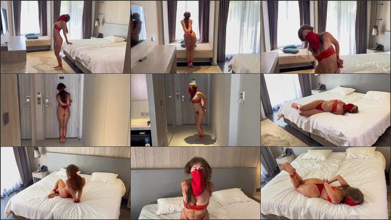 I’m tied up with red tape – my hands are behind me, and my legs are tightly tied together, my chest is wrapped with it! My mouth is taped shut and a otn is tied on top! I’m trying to get out of a locked hotel room by hopping and struggling.