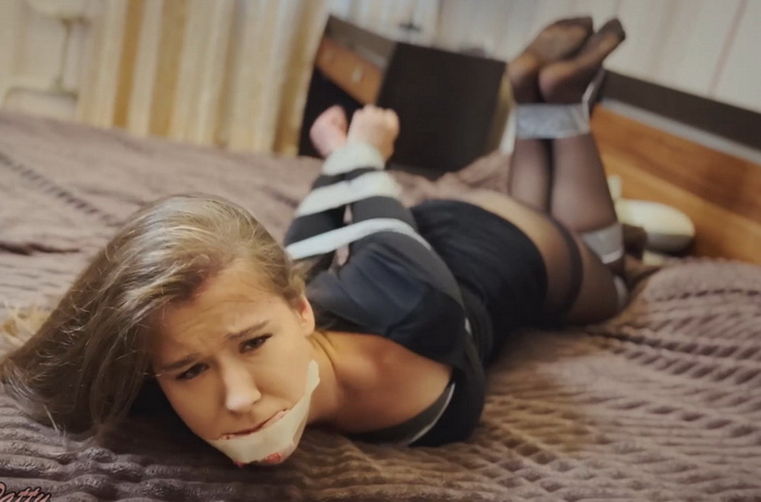 I take off my socks and reluctantly put them in my mouth. And the next second, I’m completely and tightly bound with tape in front of you.