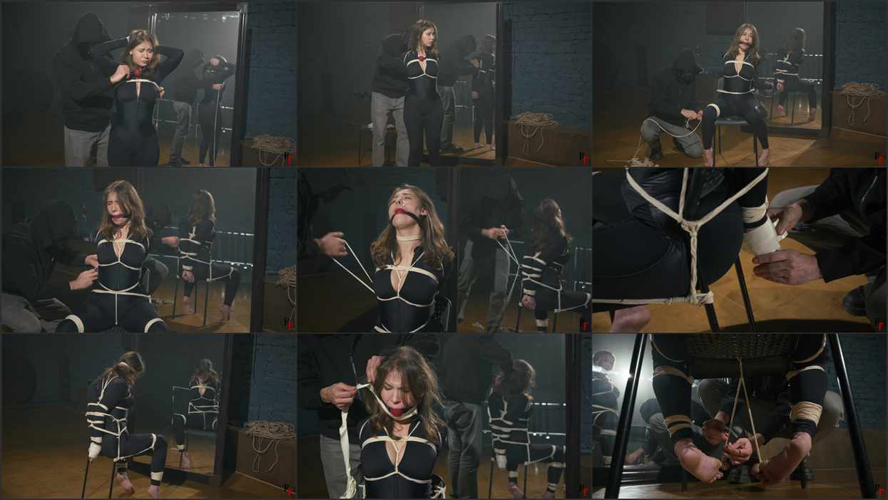He pushes a red ballgag between her teeth and seals it firmly with several wraps of microfoam tape. Her hands are also wrapped in microfoam, fully immobilizing her fingers. The guard documents his work with photos, then bends down to bind Patty’s big toes together and anchor them to the lower bar of the chair, making her feet into a vulnerable, extended position…