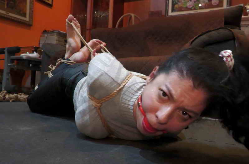 Once she is done, she leaves Liricaa struggleing alone trying to break free from the hogtie.