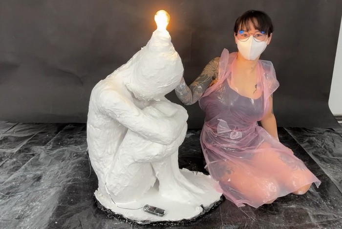 For the final touch, a light is placed upon the head of the statue, illuminating itself as a “human lamp.”