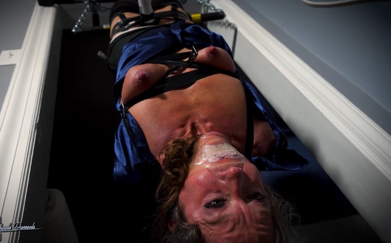 Next, he crushed her arms and legs with tape while a g-spot and clit vibrator worked what was now his hole before gagging her tightly with panties and clear tape. He hoisted her up and hogtied her in an inverted suspension, dangling and moaning as the magic wand between her legs drove her to multiple orgasms.