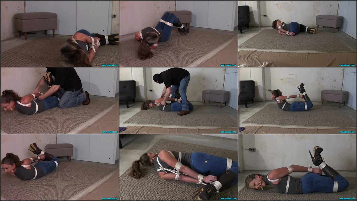 In part-2, We keep sexy portia tied up and bit gagged! We watch her with delight as she struggles against our tight ropes in her fantastic stiletto heeled knee boots! Her fit, dancers figure was made for tight bondage! Just when she is getting worn out by the struggling, we rope her up into a tight hogtie and sit back and enjoy the show!