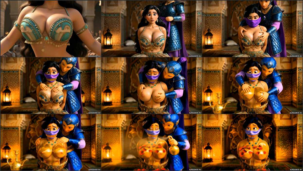 Stunning big-tit Egyptian belly dancer Dalia al-Nour is summoned to the palace. Hands tied behind her back, she sits helplessly on the floor as a dominant female servant enters. Thick purple silk scarf is tied tightly over her mouth and nose (OTM/OTN gag). The guard gropes and fondles Dalia’s massive breasts, then fastens a golden necklace around her neck and adds a golden strap over the silk gag for extra tight gag bondage.