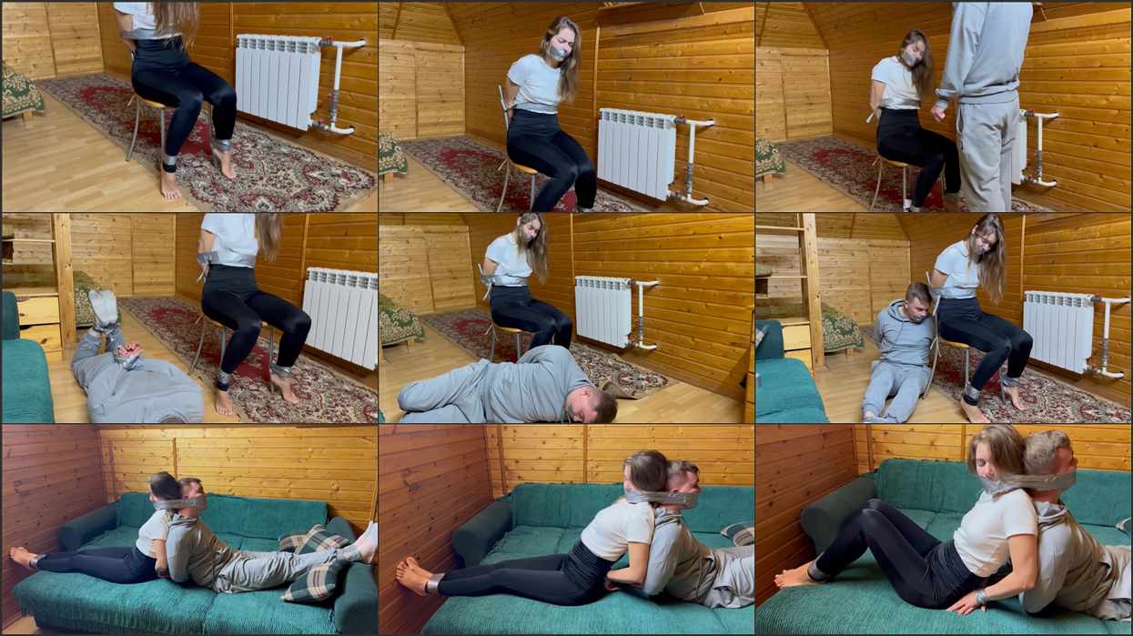 Michelle knocks him out and ties him up in the hogtie pose -and now the two of us are already tied up, I’m on the couch and he’s on the floor.