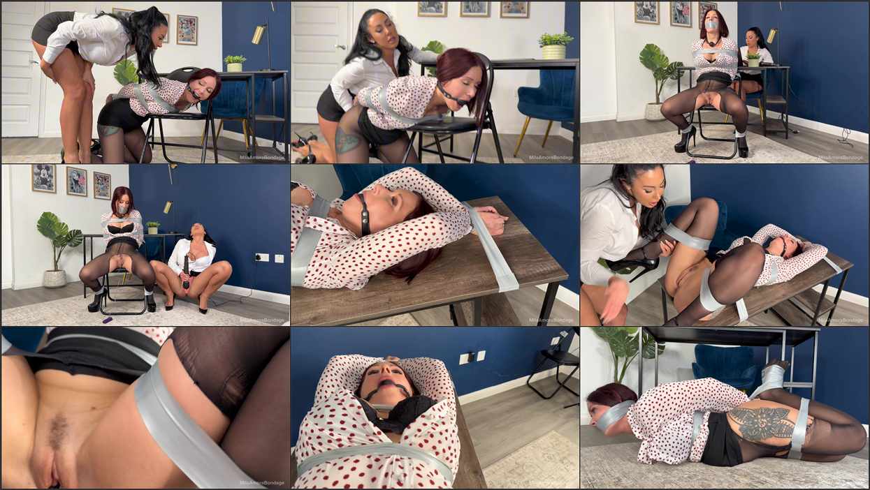 The moment the call ends, Mila moves in close. She places one hand over Belle’s mouth and gently pulls her arms behind her back. In seconds, Mila begins wrapping multiple tight layers of silver duct tape around Belle’s wrists, cinching them securely. More tape encircles Belle’s upper arms and chest — one band just above her breasts and another just below — pinning her arms neatly to her sides and pushing her chest out. A large black ball gag is buckled deep into Belle’s mouth. Bent over the chair with her ass up, the bratty Belle glares furiously as Mila rips open the crotch of her sheer black tights and slides her fingers into her exposed pussy, drawing soft moans from the bound beauty as she squirms against the snug tape in clear frustration…