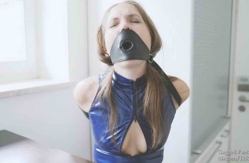 Watch Rachel gets her arms and legs bound in leather straps in the beginning scene, and see how the awesome REALISE swimsuit and latex legging shines! Then, a bishop gag is applied to her. She is then left there to squirm and drool… After a while, the gag is taken down and switched to a leather cover ballgag; she is also left there to wiggle a bit. The last gag is the leather open mouth gag, she is teased by her to stick out her tough and drool.