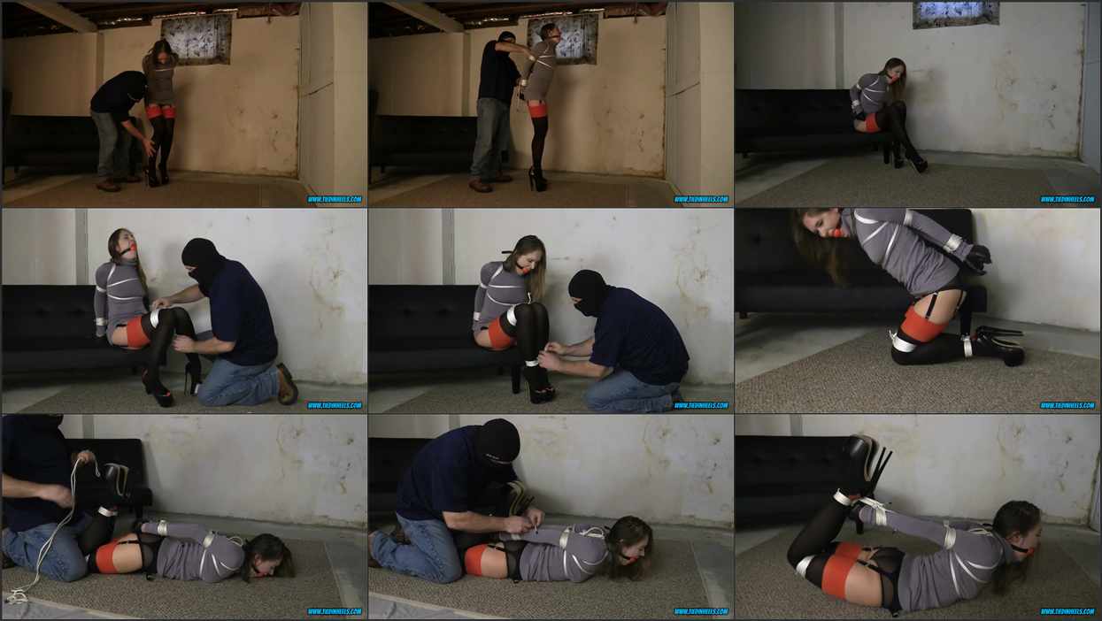 Sexy Rachel Adams is captured and taken back to the basement ddungeon for bondage torment! She is dressed in fantastic attire, turtleneck sweaterdress, garters and stockings and incredible, skyscxxxxr, platform high heels! She was definitely looking to be tightly bound and gagged! Her captor quickly takes her under complete control, she is no match against his dominant power! He methodically bind his captive beauty until she can barley take it anymore! To his delight, sexy rachel is suffering at his hands! Once fully bound, Rachel struggles and suffers to his delight! He finally ropes her up into a tight hogtie and leaves her on the dungeon floor to suffer and struggle for his amusement! Shes not going anywhere for long, long time!