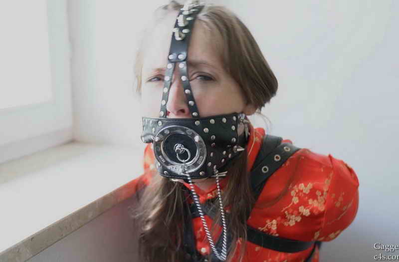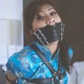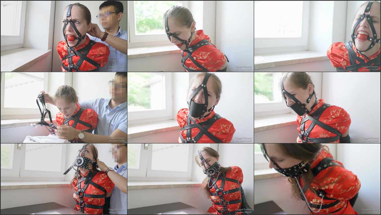 This is the first set of Rachel Adams, shot during the 2018 BoundCon in Munich. In this video she wears a classic red qipao in a leather armbinder and body harness, awaiting to be gagged. She is later gagged by a harness ballgag and left to squirm and stuggle. She really tries to get out, but in vain. The harness gag is switched to a panel gag as she continues to struggle. In the last sequence, the panel gag is taken out for the leather open-mouth gag. With this one on, she uncontrollably drools through the drain hole. She gets humiliated by playing with her tongue and drool. At the end, she takes off the gag and waves goodbye! A super short BTS is shown at the end–there was some other guests at the hotel peeping in, so she had to duck to avoid being seen!