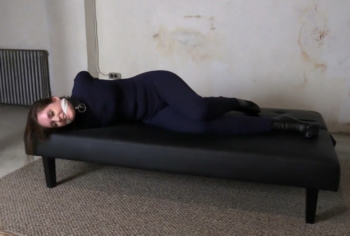 Sexy Rachel has been captured and brought down to the basement dungeon for some torment! This time she will be tightly bound and gagged and her sexy feet will get all the attention from her cruel captor! Rachel is tightly cleavegagged and escoreted into the dungeon! She is bratty and defiant but she is no match for her captor! Rachel is definitely dressed for distress, she wears a skintigh, dark blue athleticwear catsiut, black leather, platform, stiletto heeled ankle boots and short black leather gloves! Rachel is helpless as her captor progressively ropes her up! he pays close attention to make the ropes nice and tight! the ropes squeeze poor Rachel into submission and compliance!