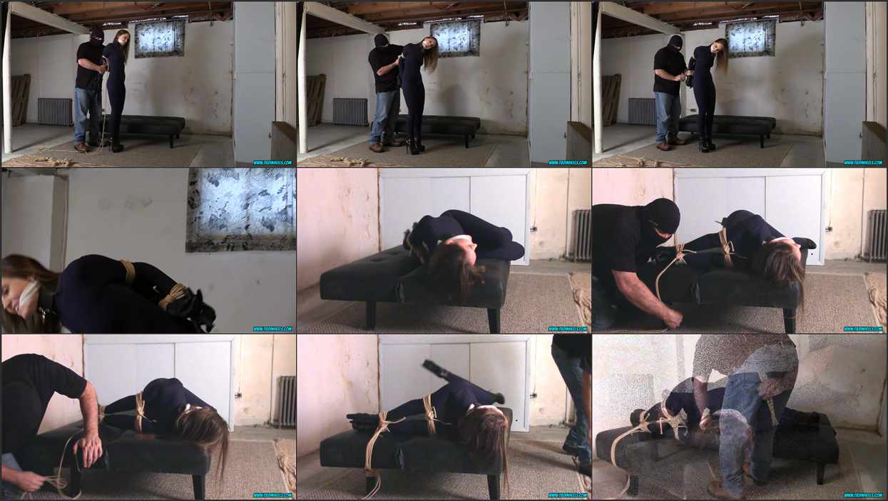 In part-1, Rachel gets her elbows and wrists tightly bound together! She struggles but it is no use! she get positioned on the black leather platform, her bound arms are tightly tied off to the platform leg, securing the sexy damsel from any hopes of escape! He then tightly ropes her thighs together, keeping this beauty from any attempt at escape!