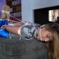 Sexy Randy Moore’s lithe, toned body is beautifully showcased as she writhes on the plush sofa, encased in the smooth, shiny satin and the sturdy nylon ropes that bind her. Her struggles only serve to emphasize her sinuous curves, the ropes accentuating her every movement as they dig gently into her supple skin.