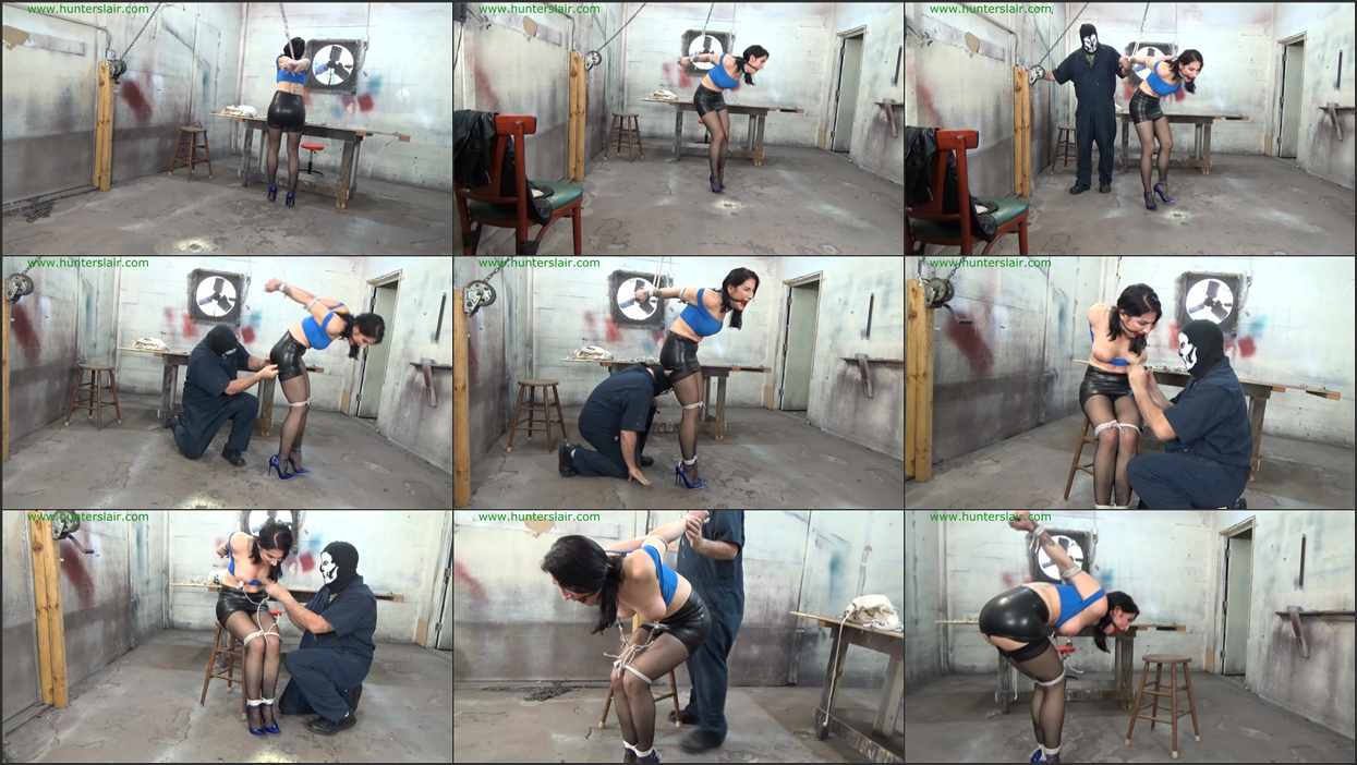 Busty Raven struggles helplessly tethered to a chain hanging down from an overhead pulley. With her forearms fused completely together behind her back by ropes crushing her elbows and wrists tightly together. Her jaw is spread open with a large red ball gag jammed between her teeth. Raven pulls at the ropes and chain trying to break free. The ropes hold her arms tight so in frustration she kicks at the winch with her stiletto heels screaming and crying into her gag for help. But there is no one to hear her muffled screams, no one that is except the Hunter. He comes in with more rope and as she begs and pleads with her through her gag he ties her legs tightly together with ropes around her ankles and knees. Her skin tight mini skirt rides up her ass as she struggles. Raven protests into her gag as the Hunter pulls her big tits out of her tiny crop top. She thinks she is going to get a little relief on her poor twisted shoulders when he puts a tall stool under her ass and lowers her wrists with the winch to let her sit on the stool. But discovers she was sorely mistaken about his act of compassion when her pulls out a set of nipple clamps and clamps them on her exposed nipples. She screams in pain into her gag as her nipples are crushed in the steel jaws of the clamps. She then watches in horror as he ties a thin rope to the chain between the nipple clamps and then tethers her nipple clamps to her bound knees. Raven begs and cries into her gag as he then returns to the winch and cranks her arms up high behind her back again. Poor Raven ass is pulled up off the stool, which he pulls away, as her poor arms are twisted up high behind her back again. He keeps cranking lifting her hands higher and higher behind her back. Raven watches the rope tethering her nipple clamps to her knees grows shorter and shorter until it is pulled taut. She begs and cries into her gag as her poor crushed nipples are pulled and stretched in the tight steel jaws of the nipple clamps. She poor shoulders scream in agony as she pulls down on her arms trying to bring relief to her poor stretched crushed nipples. The Hunter leaves her alone to suffer in the cruel bondage predicament as she struggles to keep her balance in her bound stiletto heels.