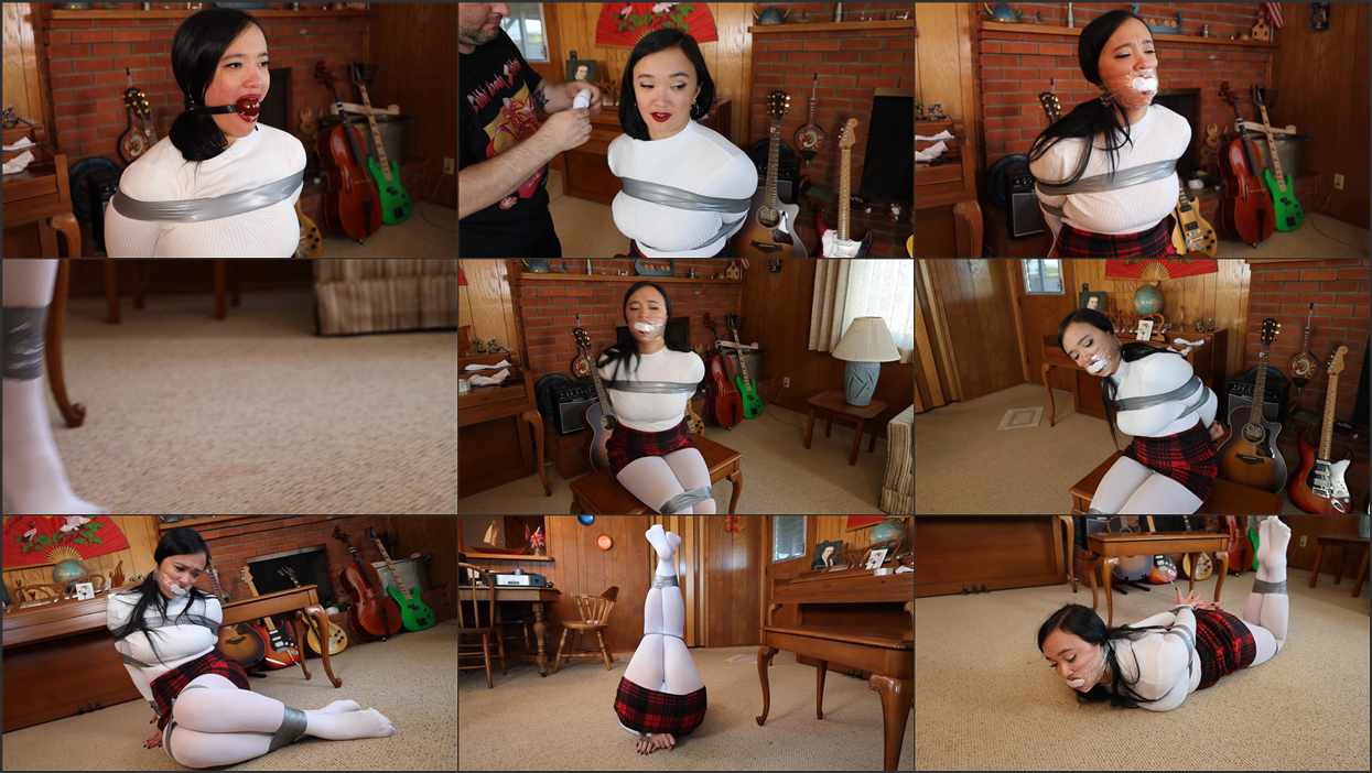 Raven Lynette pretends to be a sweet innocent girl in the party of a powerful businessman but in reality, she is a secret agent. She gets captured as she’s looking for the evidence they need to bring this guy down. She gets tightly tied up with rope, hands behind her back. Lynette is wearing a white sweater, skirt and white tights. Then she is gagged with a ballgag that makes her drool. After a while, the bad guy removes her ballgag but stuffs some socks in her mouth, once her mouth is completely packed, he gags her wrapping clear tape around. Lots of angry gagged noises, Lynette tries hard to get free, gets on the floor, rolls around, but nothing seems to work. After a long time she finally spots a pair of scissors, the key for her freedom! A long video with very tight bondage and amazing pair of gags! Almost 50 minutes of amazing tight bondage!!!