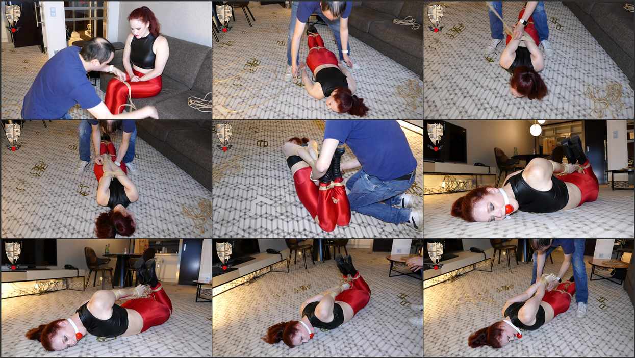Araneae is wearing some red shiny disco jeans as I am about to hogtie her and Gag her on the floor! After a few German lessons and a lot of small talk she is finally helpless. Sure she gives a great Show and tries to reach for some knots! Onscreen Tying!