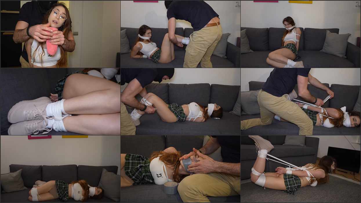 For several minutes, Rey struggles on the couch, her buttocks stretched in all sorts of positions (for your viewing pleasure!), trying to call for help. Her ordeal only begins when she’s tied up in a hogtied position! There she is, completely helpless.