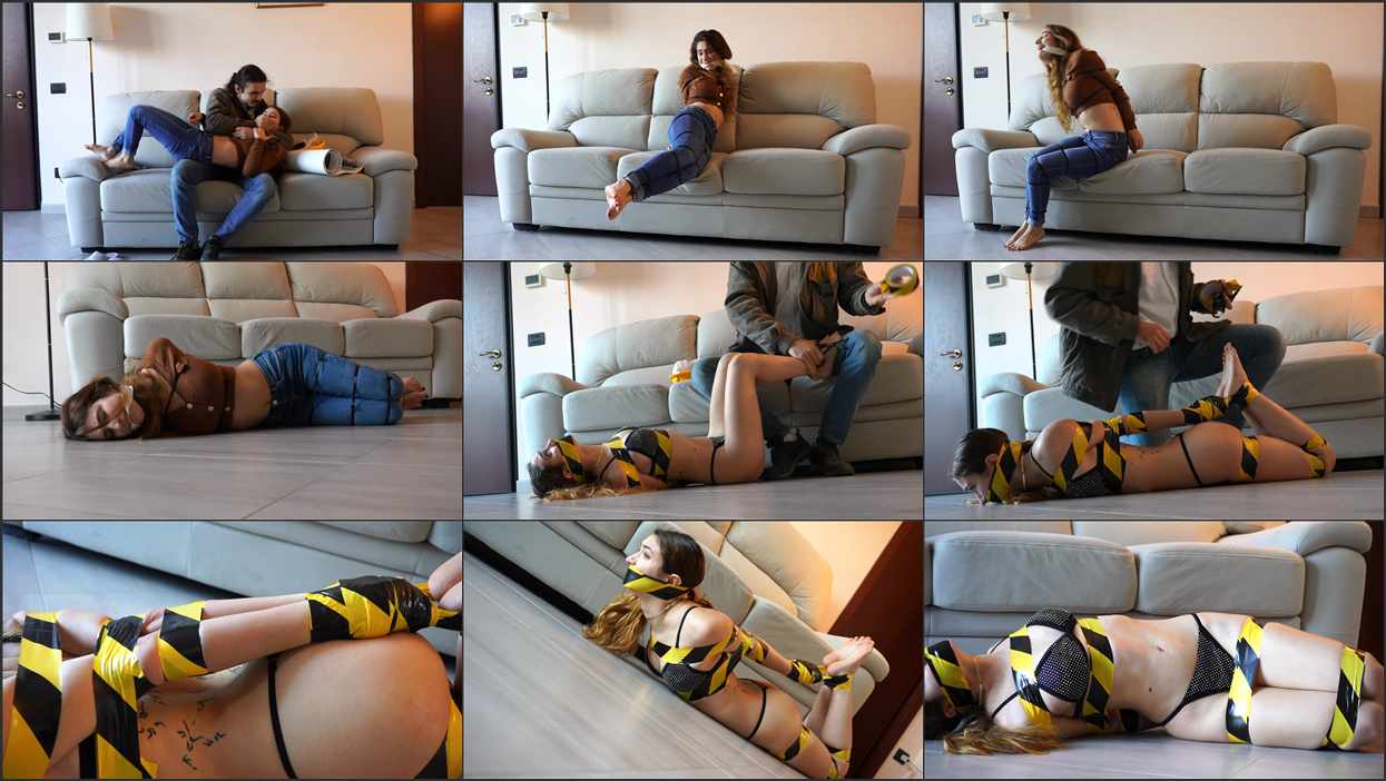Leon is the surveyor sent by the remodeling company to do the work in Rey’s garden; as soon as he enters the house, he notices that the landlady is very unfriendly and uninterested in what he has to say about the project and indeed, rude. Leon, at the landlady’s umpteenth disrespect, gets angry and decides to give a good lesson in respect for workers: a good otk spanking. As the two wrestle, the surveyor notices all the tools she has brought for the work: he leverages her with zipper ties and a cleeve gag to make her think about her rudeness; then, he strips her and mummifies her hands with black and yellow tape, locking her in a hogtie connected to a wrap around her head.