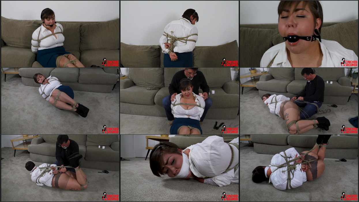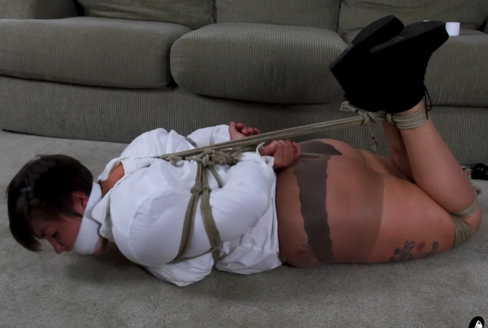 Riley Jane is a beautiful woman and a lover of rope, but she also prides herself on being able to get out of most ties. We’ll see how she does in a set of my ropes! Tied in a nice tight boxtie, her mouth is stuffed with a big rubber ball gag and before you know it, she’s drooling up a storm as she tries to get loose. No matter how she struggles, she’s staying put, especially after I come in and improve things a little bit! I stuff her mouth with an old pair of panties and wrap her face tightly with medical bandage, and she’s soon nice and quiet! That comes in handy when i pull off her skirt, tie a a nice crotch rope and snug it up good and tight, and then finish it off with a cruel hogtie that leaves her thrashing and rolling about on the floor, the rope digging deeply into her ass and pussy. Seems she’ll be with me for along time to come!