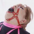Mina wears a shiny silver bodysuit, with skin tone pantyhose underneath and she is barefoot. She is subjected to a very stringent hogtie, her head is encased in an open mouth ring gag harness and is pulled back and tied to her welded elbows. Not much she can do here but endure for our pleasure. Half way through the video I decide things are not tight enough and work on getting her into a bit more of an arch, I think I succeeded ???