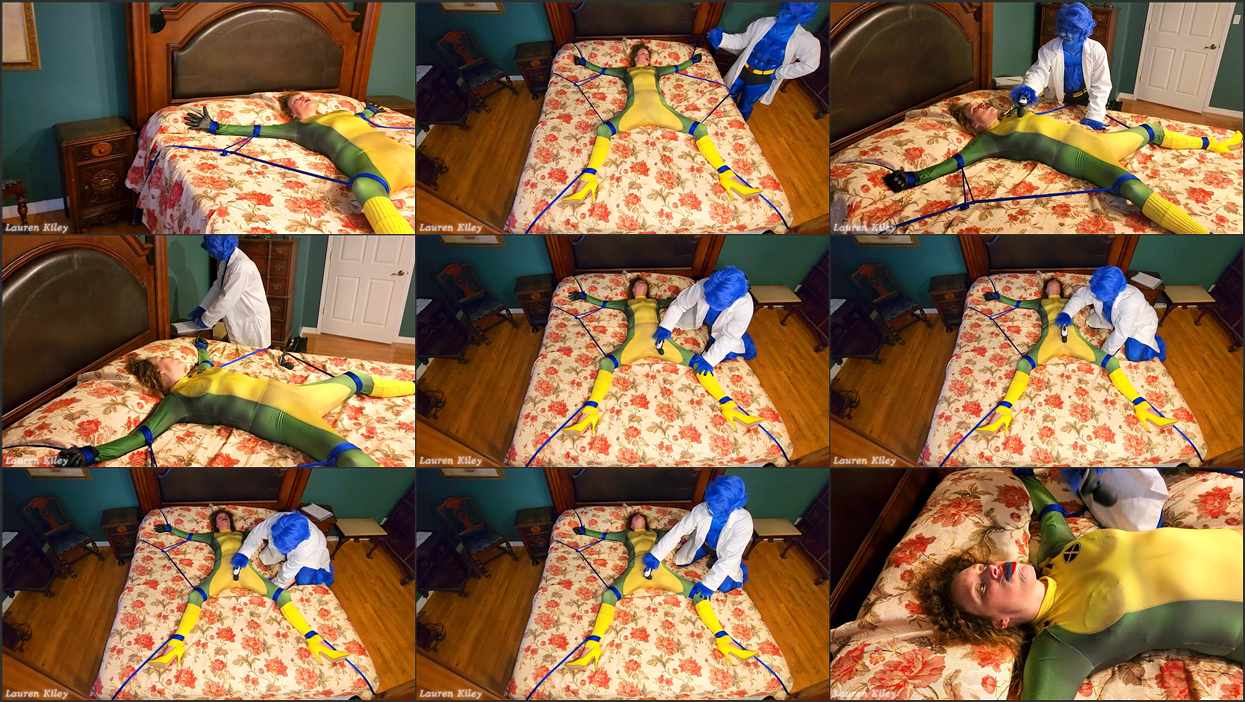 Rogue is bound with her limbs spread on a bed, still clad in her tight stretch uniform, leg warmers, high heels, and leather gloves. Her mouth is gagged with tape so you can her moan as she writhes beneath the ropes. She is joined by Beast in lab coat, who explains the experiment she is undergoing. Beast examines Rogue’s body, alternately caressing, tickling, and groping to test her reflexes. She discovers a new device that is meant to enhance her abilities through sexual stimulation! Beast rubs the vibrating wand over all of her subject’s most sensitive parts, enjoying and recording every sound of distress and pleasure. Helpless to do anything but submit to the experience, Rogue lays beneath her bonds and endures endless waves of stimulation and orgasm until the good doctor has decided she has everything she needs for this round of scientific discovery.