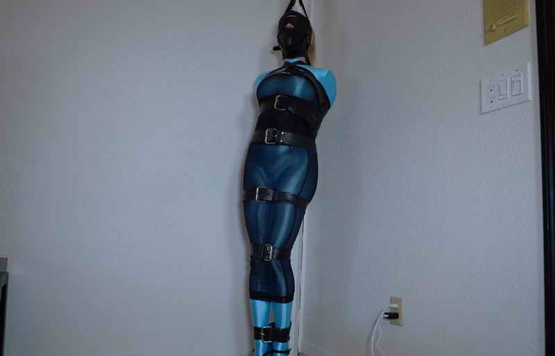 Sexy Sage Pillar is progressively bound and encased wearing a silky ice blue catsuit. She starts by slowly pressing a SilentSilicone mouthfilling gag into her mouth. The gag fills her entire cavity and makes it impossible to speak. Next, Shiny puts a soft leather ‘Sweet Gwen’ hood over her head and laces it up tight. Next Sage’s arms are laced up behind her in a tight armbinder and her body is encased in a tight black nylon sleeve over the top. A strap is fastened around her head and anchored up above her, and then she is belted to the post behind her with thick leather straps. Finally she is blindfolded and left there to feel out her helpless predicament. Shiny steps back in and places a wand vibrator between her legs and Saga squirms and moans until she is cumming hard!