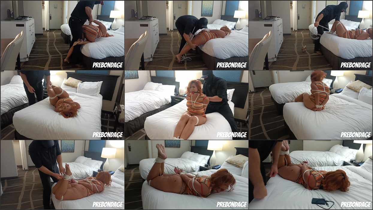 Sahrye sits at her desk trying to get some work done when a knock comes at the door. Not trying to be bothered she politely tells them to go away, but still the knocking continues. She finally gets up angrily to tell them to go away. As soon as the door opens however are large masked main grabs her by the throat and leads her back into the room. He tightly binds her hands behind her back, shoves a ballgag into her mouth, & proceeds to hogtie her on the bed. But what is he after…valuables, just looking for a hide out, or maybe hes after her?!