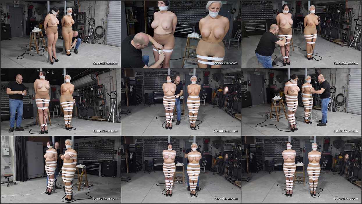 Sandra and Gia’s Standing Wand Orgasm Endurance While Wrap Gagged, Pole Taped & Tits Tied – All On-Screen Action!