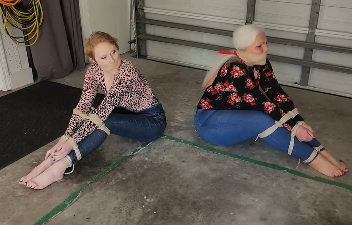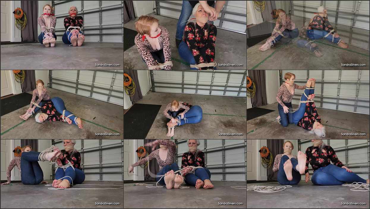 Inside a suburban garage, two tantalizingly tethered temptresses await rescue. Sandra Silvers, the sultry silver-haired MILF with sun-kissed curves wearing a black floral bodysuit straining across her substantial bust, sits strictly secured in a severe ball-tie. Thick unbleached hemp ropes weld her wrists to her calves, arms and denim-clad legs in a compressed bundle. Her red pedicured toenails splay helplessly against the concrete, bare feet and wrinkled soles exposed, while a red bandana cleave gag fills her mouth.