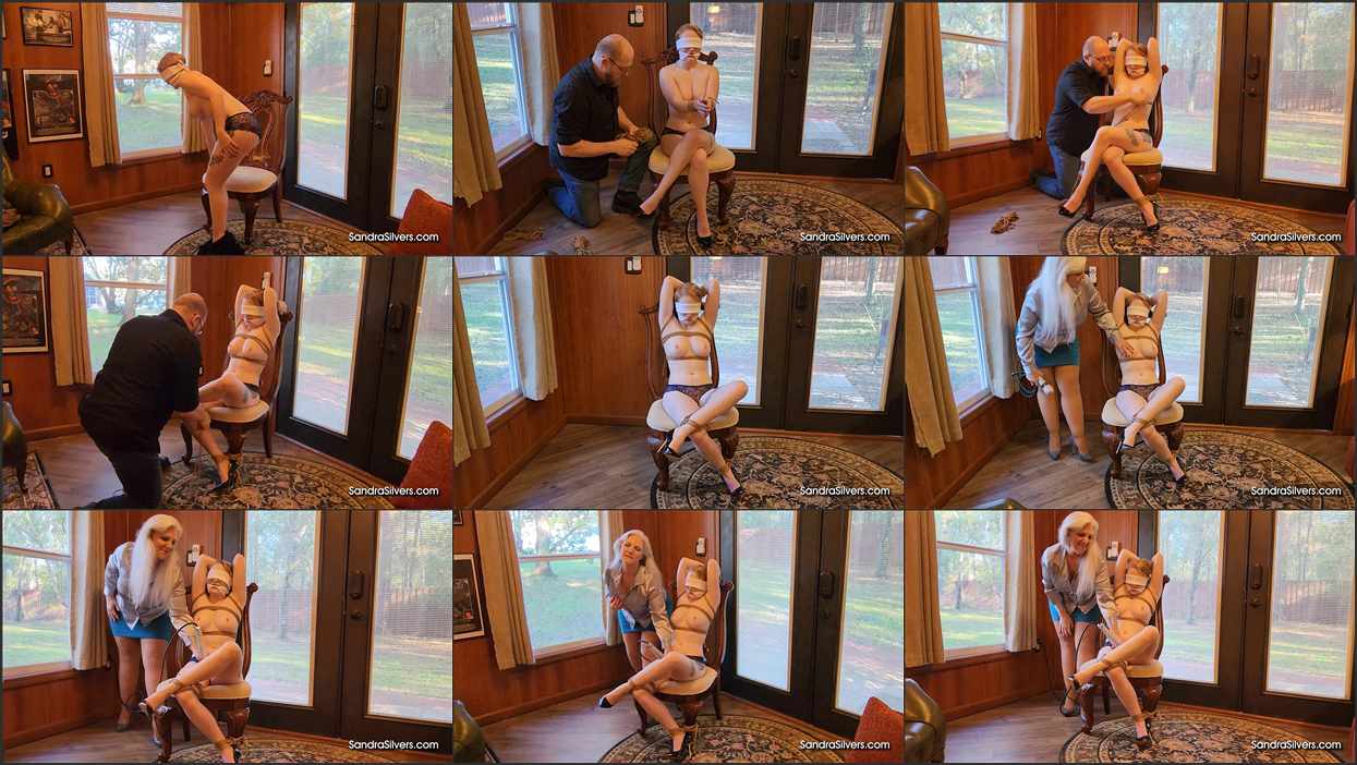 Now busty beauty Sandra comes in and begins to toy with Izzabella. In her own silky blouse, skirt, nylons and heels, a smiling Ms Silvers plugs in a vibrator and teases the chair-bound lovely, also stroking her breasts sensually. Izzie whimpers excitedly at Sandra’s touch and the buzz of the wand. As the willing captive builds towards a climax, her naughty mistress fondles her own boobs happily. When the vibrator is withdrawn, Sandra leaves with a kiss, and Izzie sighs, left wanting more. Will she get it? Will she be released? Questions, questions…