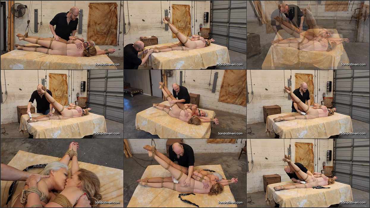 Jackie Christianson and Sandra Silvers are tied up with hemp rope on a mattress in Ben’s warehouse. Wearing only pantyhose the women lay face to face, their torsos are pressed together, arms wrapped around each other, and their legs tied to one another’s, Sandra’s left leg tied to Jackie’s right leg, and vice versa. Ben enters through an overhead garage door, startling the cleave gagged women with this surprise noise behind their heads. Ben hoists their legs into an open predicament using an overhead hoist, and proceeds to massage, tickle and torment the pair with a double headed Hitachi wand. As the women melt into the vibrations, Ben cuts open their pantyhose to bare pussies, and removes their bandana cleave gags, encouraging the pair towards lesbian kissing for the gorgeous girl-girl orgasms that result!