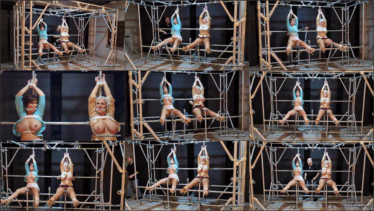 In the cold, humming heart of The Silverdrome — a cavernous, retro-futuristic warehouse lab pulsing with neon shadows and the faint scent of steel polish — two curvaceous MILFs of the bondage elite are suspended in Ben’s latest engineering marvel: the D.R.E.A.D.K.N.O.T. — The Department of Bengineering’s Damsel Restraint Erection Applying Diverse Kinesiology, Nefarious or Tempered. Behold Syren DeMer, raven-haired temptress in a form-fitting blue satin blouse, and Sandra Silvers, your sultry silver-haired goddess draped in a shimmering gold blouse — both seated upright in a state-of-the-art steel bondage frame that cages, controls, and consumes their luscious hourglass frames. Their wrists are lashed, arms above their heads, thighs spread and pinned apart by cold chrome bars — a perfect display of restraint and revelation.