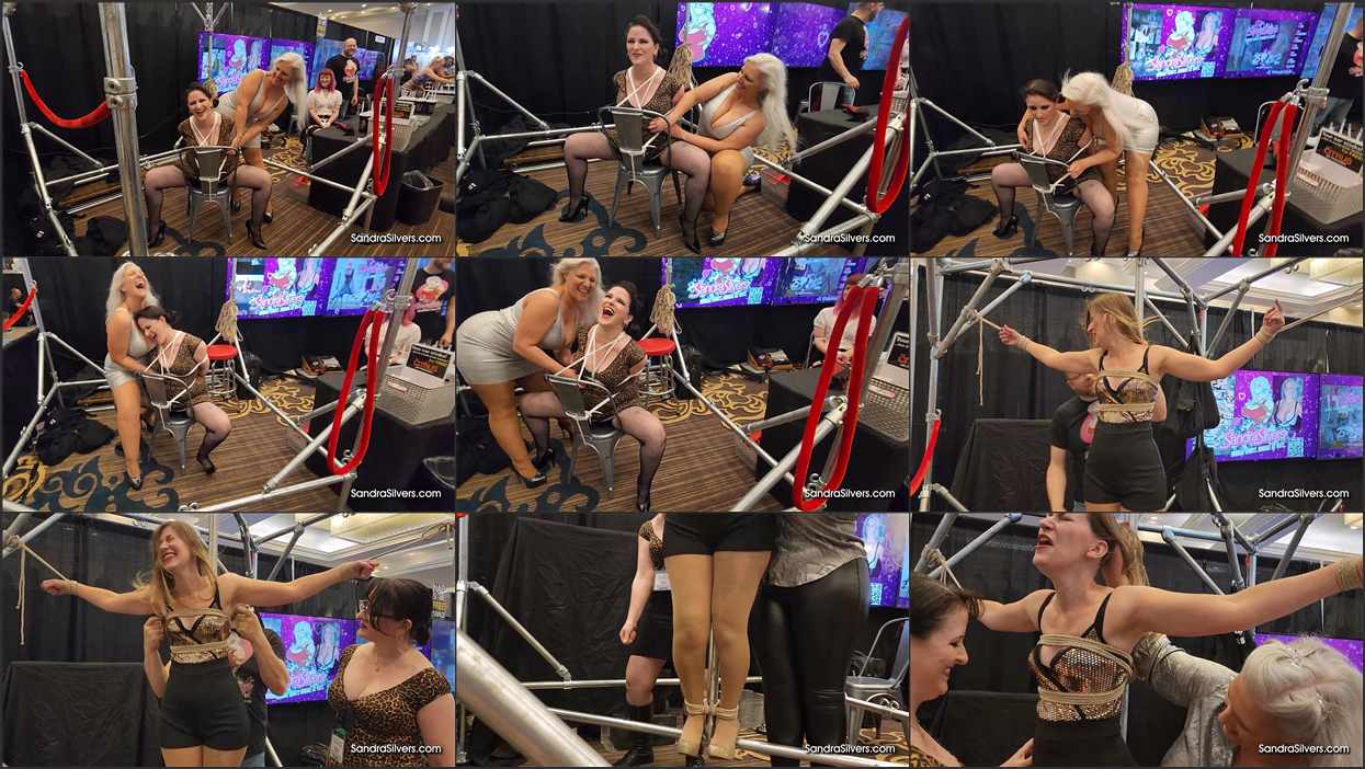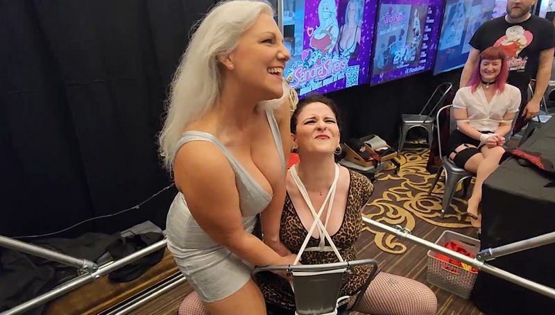 Straddling a chair backwards we see Caroline in the midst of being bound by Sandra, with AJ Marion and Ben looking on. Finishing the tie, Caroline is completely helpless against Sandra’s skilled fingers that finds every spot to make her laugh! Under her arms, down her stomach, under her neck and over her thigh, no spot is safe from Sandra’s tickling! Caroline laughs, cackles, and giggles, leaning this way and that but bound in place. This goes on for a little while… Then it’s Catherine’s turn to be tickled! Tied standing with her arms outstretched, Ben begins to tease her before the tickling torrent begins! Catherine laughs hard, her head turning this way and that as she struggles against Ben’s seeking fingers. But if Catherine was worried about Ben…now she has Caroline to deal with, too! Double tickling, the doms deftly tickle her legs, armpits, thighs, tummy – nowhere is safe! Soon Sandra steps in for the fun, too! Poor Catherine ends up positively gasping with laughter as groups of fingers find her sensitive spots and tickle tickle tickle! If you were a passerby at Fetcon Tampa, would you stop and watch each woman get tickled? Find out more about the event at FetishCon.com