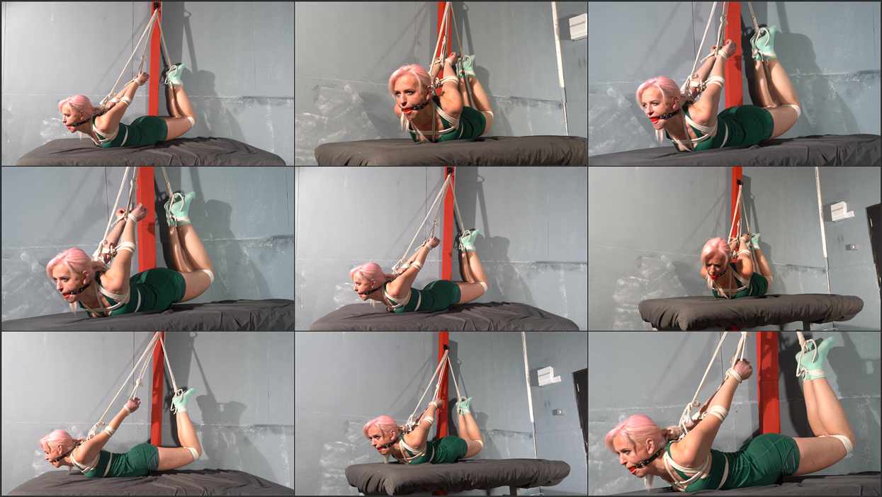 Sandy wants to do something harder. So we do a dangle hogtie. Her knees are lifted off the table and she is given a drool inducing gag. Just watch.