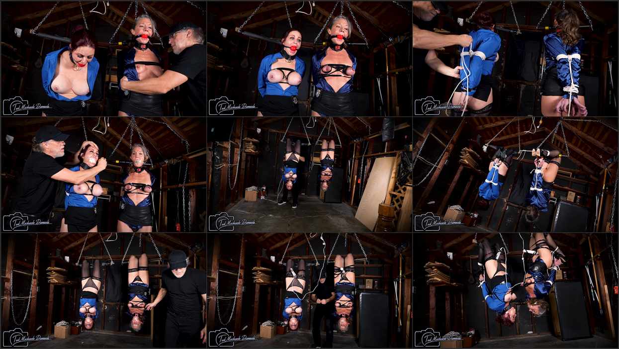 Both beauties in blue hung inverted, suspended by their knees in tightly rigged inverted hogties, the world and control turned upside down. This was the position they had chosen through their actions, challenging, exposing, and intense. Their uniforms strained against them as their breathing grew shallow, every small movement setting them into a slow, helpless sway. Their chests were tightly, breasts bulging in bondage, the sensation making them gasp behind the gags they opened wide to accept.