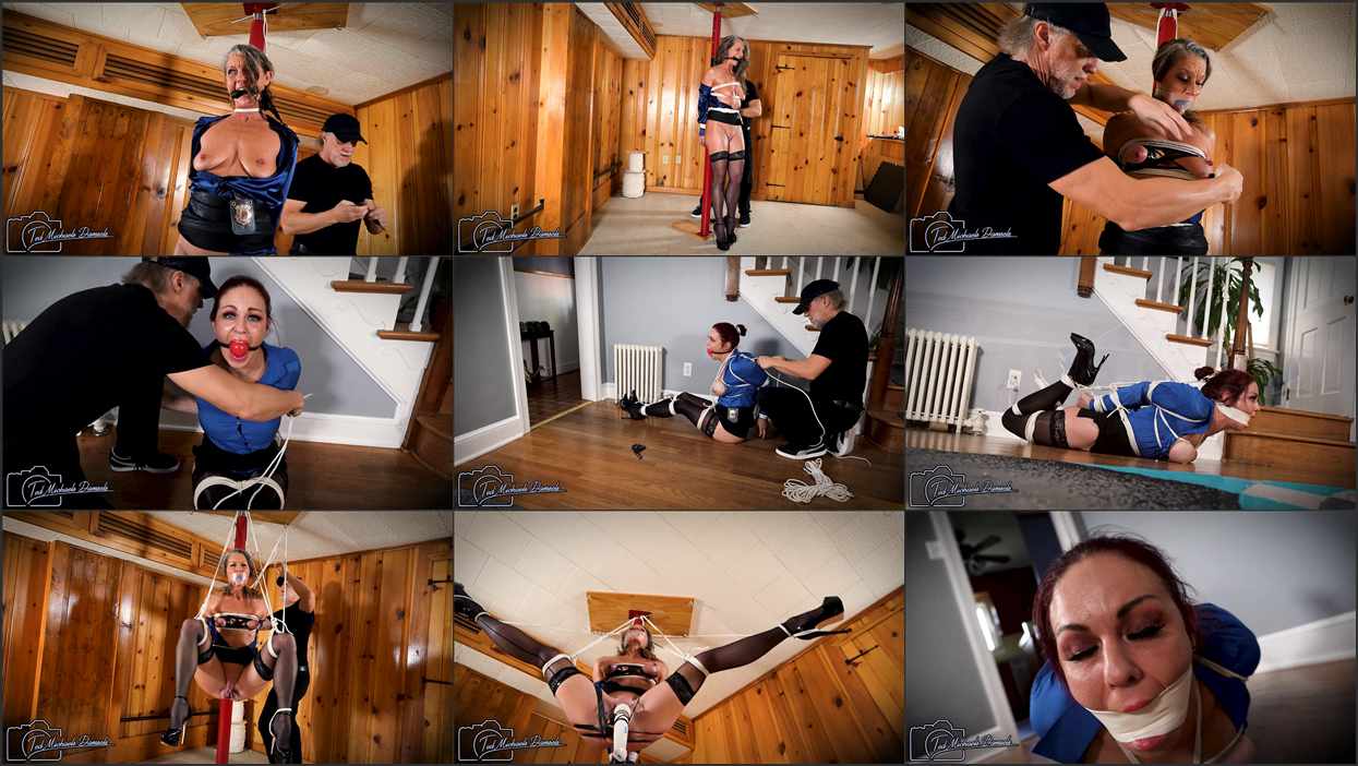Upstairs, Sarah lies helplessly restrained, every nerve humming as the vibrator between her thighs teases her pussy until she groans. Downstairs, Portia is held open and vulnerable, suspended and punished by a relentless buzzing stuffed into her pussy and against her mouth that leaves her groaning and trembling.