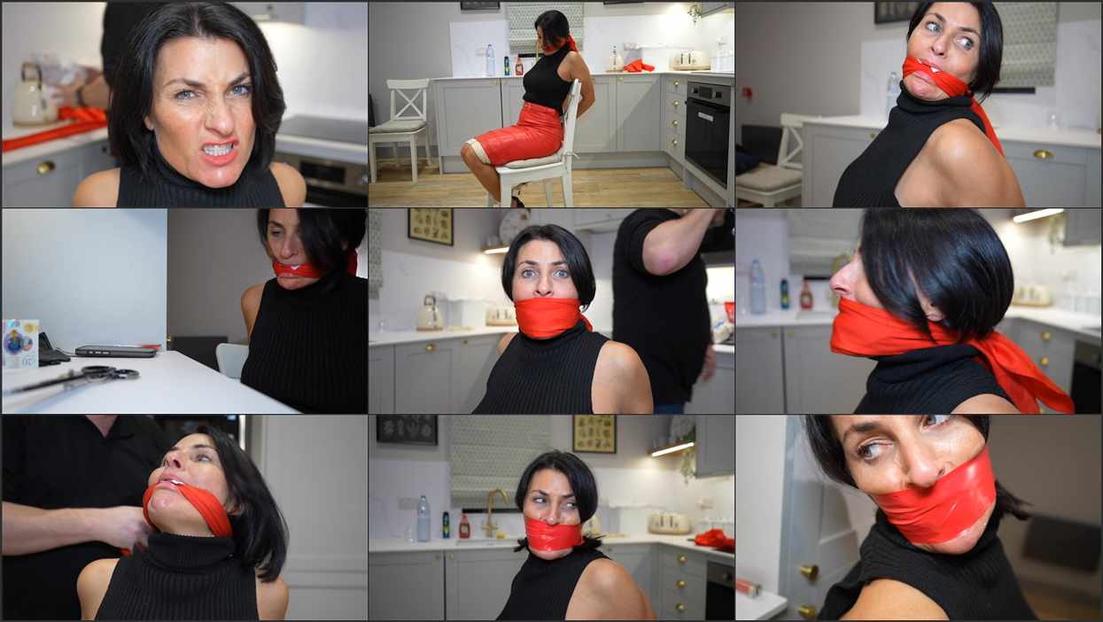 Sarah Wild is agent red and she has been captured by an enemy good while investigating a secret mission. The black haired milf been dragged to a hideout where she is then tightly tied to a chair with rope. Agent red protests and gives the goon a piece of her mind, but this only gets her a good gagging. The man stuffs her mouth with his white handkerchief and gives her a n8ce tight red scarf cleave gag to keep her quiet. He tgen leaves her as he gies to figure out what to do with her. Wearing her signature red leather gloves, skirt, turtleneck jumper and heels, she struggles against her bonds. Unable to spit the cloth from her mouth also she is totally helpless. She looks around fir anything that can help her get free. Then she notices a pair of scissors on the side. She shuffled the chair over to the counter top and attempts to reach the scissors. She trys with her hands but the rope tied to her ankles wont permit her to reach any further. She then tries to reach them with her head and mouth and again they are just too far away. After a while of struggling the goon returns and notices her failed attempt. He drags her back in the centre of the room as she curses him through the gag. The man then takes another red scarf and gives sarah a tight over the mouth gag to muffled her moans even more. Again sarah is left to struggle. Time passes and the man once again returns…
