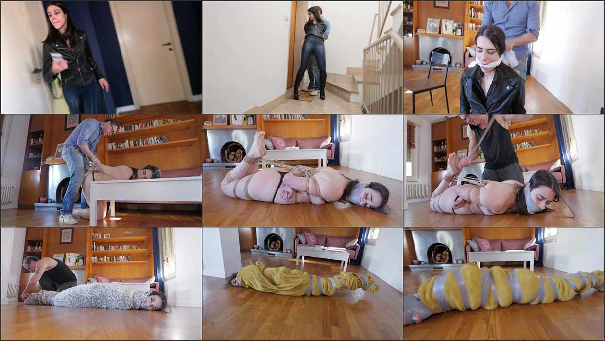 Scarlett is investigating Tony’s financial embezzlement and plans on reporting him during the evening news. Scarlett is seen sneaking around the outside of his house, peeking in windows. She’s dressed with tight leather blue leggings and leather jacket and boots. She is trying to be as quiet as possible and tries the door, which is unlocked. She sneaks into the house. We see Tony typing away at a laptop and speaking to someone on his phone, telling the other person that the transaction is almost complete and job is done. Scarlett starts recording Tony with her phone from the other room. She’s excited because she’s going to get the story and be able to report it. Then, accidentally she makes some kind of noise. Tony whips his head around, and she is hiding on the other side of the wall, holding her breath and terrified that she’s been discovered. Tony is suspicious and gets up to see what it is and Scarlett runs. She makes it to her car and jumps in the driver seat, forgiving to lock the door. She then starts trying to call her headquarters, but realize that she doesn’t have a signal. And she is panicking. Suddenly, her door jerks open and Tony drags her out out of the car, spins around and clamps his hand over her mouth in a vicious handgag. Scarlett can only mumble as she is handgagged so tightly. Furious, Tony drags her back into the house and pushes her roughly into a chair. He wants her not to make a sound. She’s looking around, terrified and trying to figure out a way out of this…