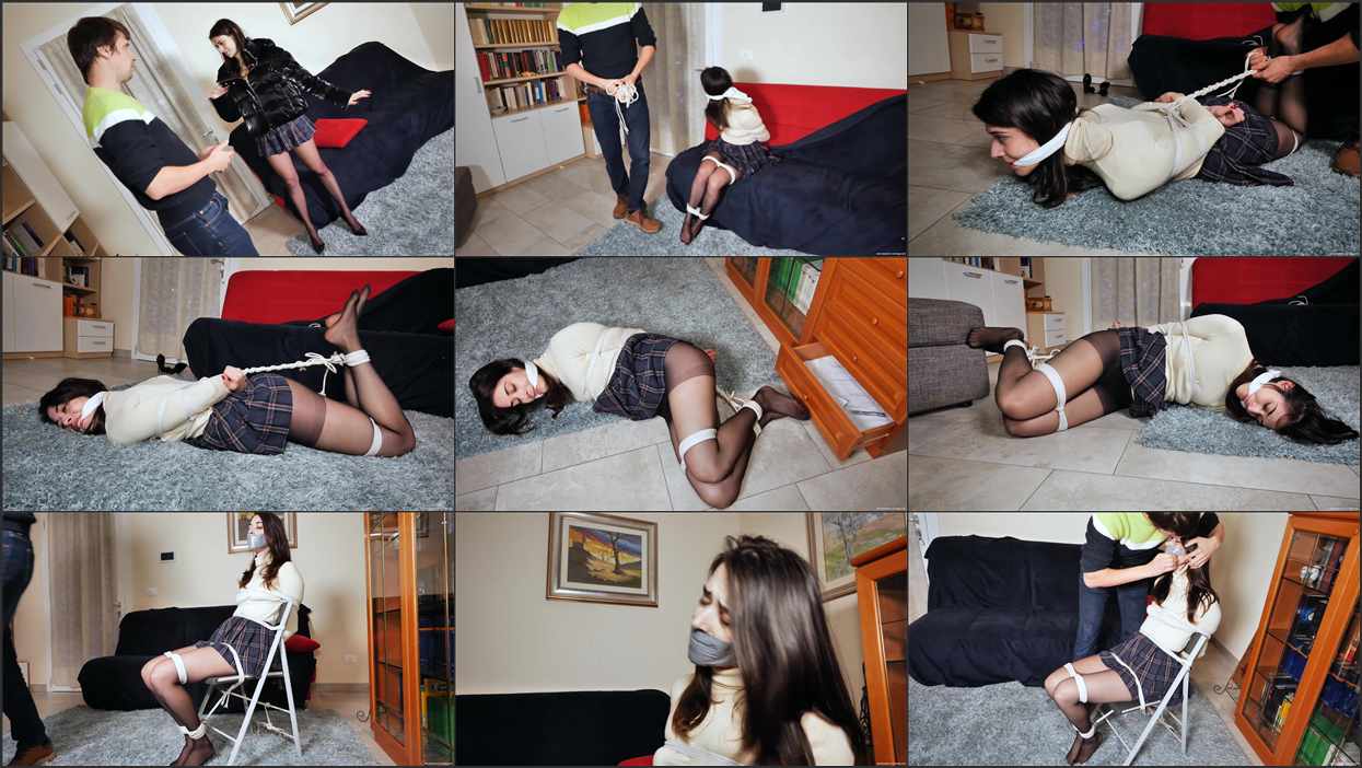 Scarlett is a babysitter who has been called by a new client, James. When she arrives at his home, however, it turns out that he does not have a baby, and only wants to tie up Scarlett. He says he will pay her the same rate for this. Scarlett says no and is about to leave when James grabs her and hand gags her. Soon, she finds herself tied up with ropes and struggling on the floor. She attempts to get away, but James stops her before she can exit. To make sure she does not do that again, he places her in a hogtie on the floor. This does not stop Scarlett trying to find something to cut herself free, but while she is attempting this, James returns and catches her in the act. He now ties her to a chair to make sure she can’t go snooping any further. Heavily tape gagged, Scarlett can raise no objections.