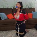 You tell her to stay seated as you grab a length of rope. Confused but compliant, she obeys—watching as you start to bind her wrists and body to the chair. She looks startled but too desperate to argue. When you pull out a large ball gag and push it between her lips, a muffled whimper escapes her, followed by a submissive nod…