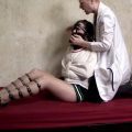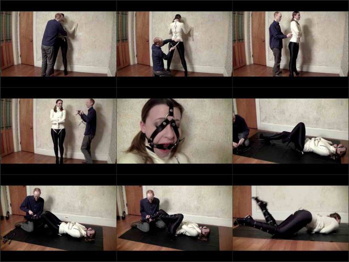 Serene and Kevin are poised for her to have some fun in some shiny black tights and a white latex straitjacket. Serene slips her arms into the sleeves and has it zipped up her back before the crotch straps are fixed and Kevin takes a few steps back to admire his handiwork thus far. He then comes back and pulls her arms through the loop strapping her arms behind her. He feels her smooth tights a bit before putting Serene in a head harness ring gag. Finally Serene is put down on the ground and her shoes replaced with Kevin’s fetish ballet splints. Serene is then left to struggle and enjoy her bondage.