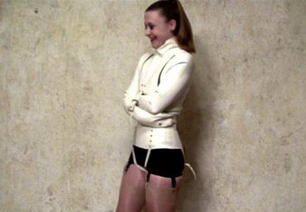 Serene and Kevin are poised for her to have some fun in some shiny black tights and a white latex straitjacket. Serene slips her arms into the sleeves and has it zipped up her back before the crotch straps are fixed and Kevin takes a few steps back to admire his handiwork thus far. He then comes back and pulls her arms through the loop strapping her arms behind her. He feels her smooth tights a bit before putting Serene in a head harness ring gag. Finally Serene is put down on the ground and her shoes replaced with Kevin’s fetish ballet splints. Serene is then left to struggle and enjoy her bondage.