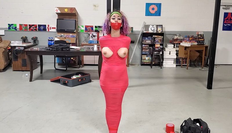 Poor Simone! Taped to a pole in an old warehouse wearing only a bikini, her mouth stuffed and taped shut, she makes all the noise she can to alert someone to her predicament, but she’s stuck fast and totally at the mercy of the stranger who arranged her plight. When he returns, she begs for release, but the mouth stuffing and tape turn her pleas into muted “HmmmmppphH”s and desperate hums which her captor easily ignores. Simone’s fear increases as the stranger slowly, very slowly removes her bikini leaving her completely nude in the freezing building, but she’ll be warm again very soon, as he begins to wrap her body in tight medical tape! He pulls each roll taunt as he winds it around her ankles and slowly makes his way up her helpless body, and Simone realizes VERY quickly that not only do the bandages mean escape will be impossible, but that captivity will be unendurable, because once the bandages are on her body, they begin to contract and tighten even more! Soon, just breathing is an ordeal for the sexy Simone, and she can only whine as her entire body, from shoulders to feet, becomes encased in the crushing cocoon! The sick stranger has left her big natural tits free, and Simone is terrified at what he may do to them. Her question remains unanswered as the stranger then begins to apply a SECOND layer comprised of vinyl marking tape, even tighter than the first, and each band immediately begins to shrink once applied to her helpless frame! Now truly helpless, Simone can only watch in despair as her assailant tapes a pair of scissors to her body. She sobs, knowing she can never reach them! Her captor still isn’t finished, and the medical tape returns and begins a series of circuits around her lovely face and head, fusing it to the pole! Now with only her nose free, she can no longer see ANY of what remains in store for her, and whimpers in fear and apprehension as she waits for her captors return. When he comes back, he carries more of the horrible red tape, and Simone’s head encasement undergoes a second layer! Now, with her body completely immobilized, her head crushed in the vice-like grip of the tape and bandages, and her assailant gone, Simone moans in total helplessness and despair. The only visible movement from the girl is the slight bulging of her throat when she tries to summon help, each cry dying in her throat like the cry of a small trapped dove!