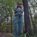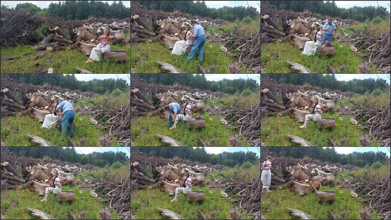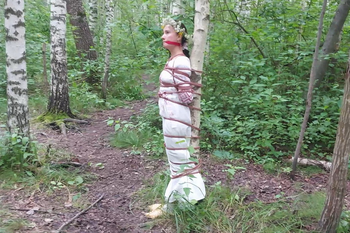 Sofi in a ethnic dress is walking through the woods. A man in dark glasses tied her up with jute ropes.