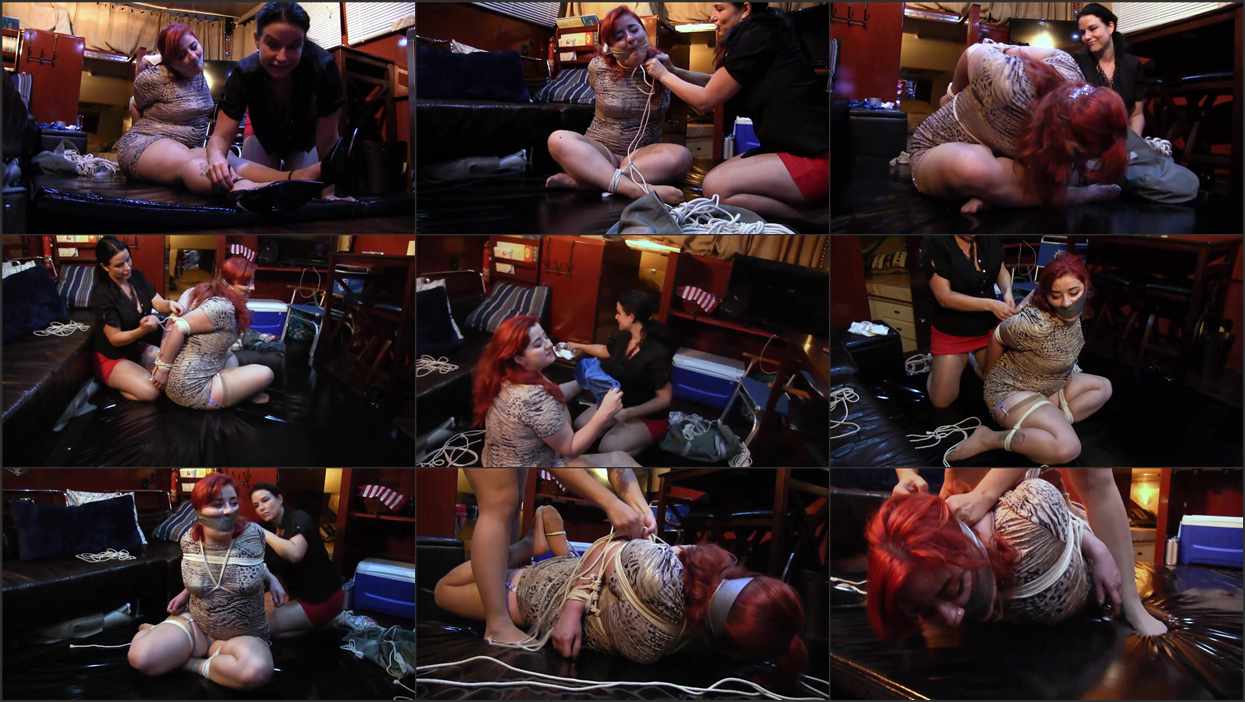 We took Freshie out on the boat on a clear but cold day during the week. I figured I would be able to shoot on the back deck without anyone being able to see. Well the weather changed quickly and the wind really picked up. We headed back in and shot her at the dock instead. Here she gets elbow tied and tied indian style with her head pulled down to her ankles. She has been harshly cleave gagged, then it is time to change the gag from that to a squishy ball and clear tape. I tip her over and demonstrate that it is a good tie for sex. She has never been in this position before. As I release her from it her response was that it seems kind of dangerous. I don’t think she cared for it. I have her stuff her mouth and then wrap duct tape around her head and then she is retied into a frogtie, elbows tied together and hands off to the side. Her hair is pulled back into the tie and I let her struggle about like that.
