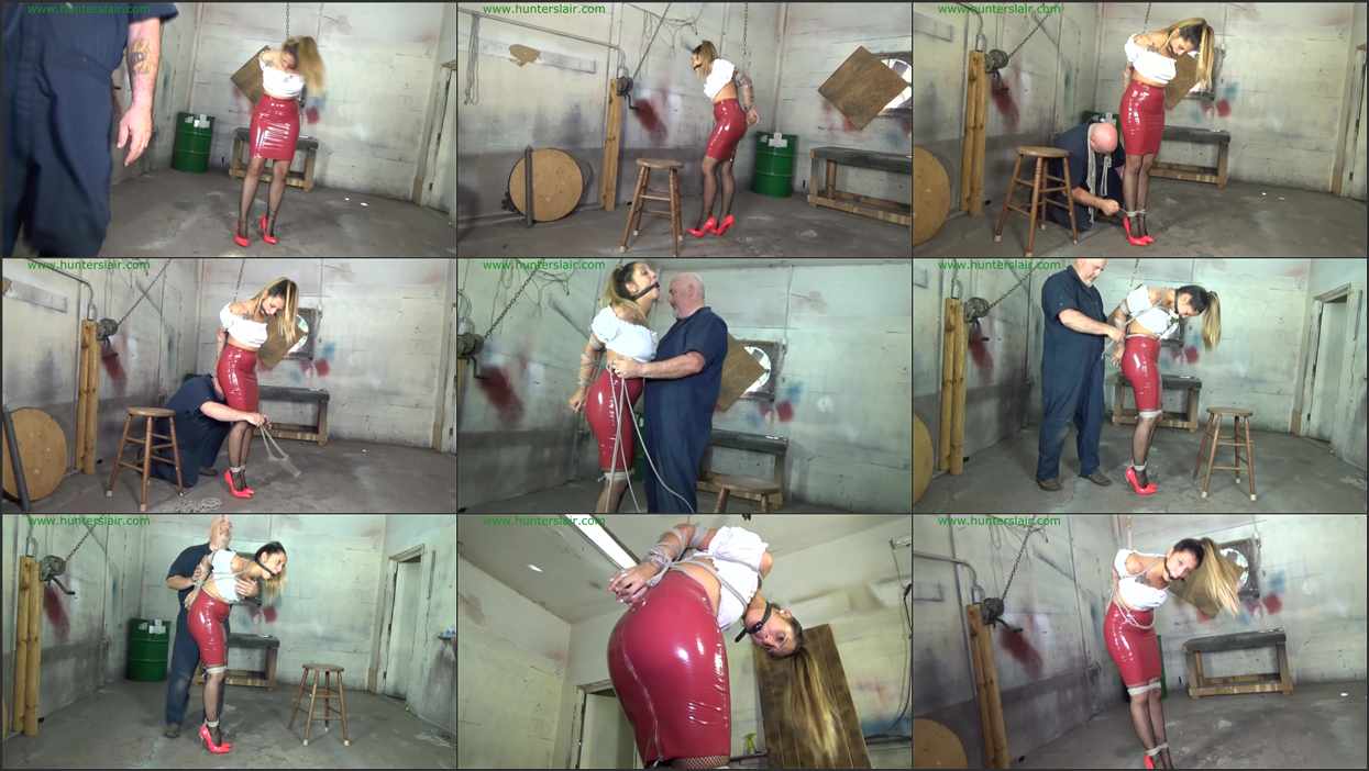 Hot sexy big booty Brazilian Stefania is pushed into the lair bound and gagged wearing a skin tight shiny pencil skirt, tiny white crop top, stiletto heels and fishnet stockings. Her elbows are welded together behind her back with ropes woven down her forearms to her wrists. A black ball gag is jammed between her teeth to keep her quiet. The Hunter attaches her crushed elbows to a chain hanging down from an overhead pulley and leaves her alone to struggle at the end of the chain. Stefania twists and turns desperately trying to free her elbows from the chain and escape. But she can’t free herself so in frustration she kicks at the winch in a futile attempt to free the winch and get some slack in the chain. But all her struggles are for naught. The Hunter comes back in with more rope and ties ankles and knees tightly together. The more ropes are wrapped around her shoulders and then run down her arms to her wrists. He runs the rope up between her bound wrists then jerks her arms into a cruel chicken wing. Stefania cries in pain as her elbows jut out and her wrists are cinched to her back. The Hunter cranks the winch tight and leaves her sobbing and crying into her gag wondering how long she will have to endure the cruel bondage and get to see her hands again.