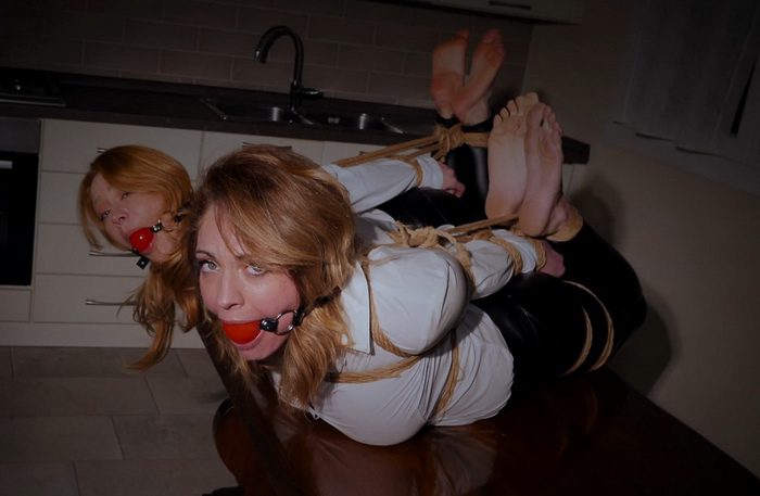 Stella doesn’t return, and Alba tries to contact her but fails… Suddenly, a hand grabs Alba, and Alba ends up tied up too, with lots of rope, a huge gag, and locked in a small wooden house. Alba struggles, the ropes are too tight on her body… Meanwhile, Stella writhes desperately on the floor, now gagged with an OTM…