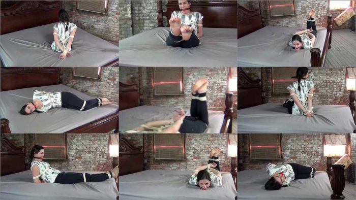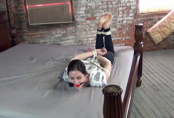 Addie Juniper joins GIB in a blazing hot clip of her in a feather print t-shirt and dark jeans. Her hands tied behind and ropes at her knees and ankles. Of course she is barefoot as she shows her toes and soles to view. Addie wiggles and worms about testing the ropes as she playfully struggles and gag talks thru the red ball gag.
